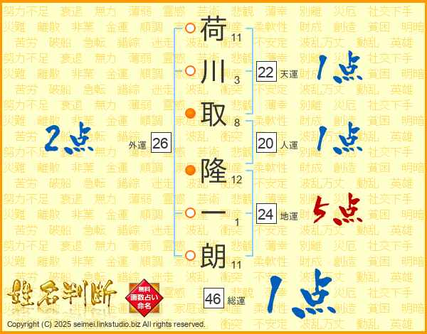 荷(11画)川(3画)取(8画) 隆(12画)一(1画)朗(11画)