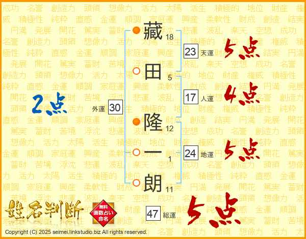 藏(18画)田(5画) 隆(12画)一(1画)朗(11画)