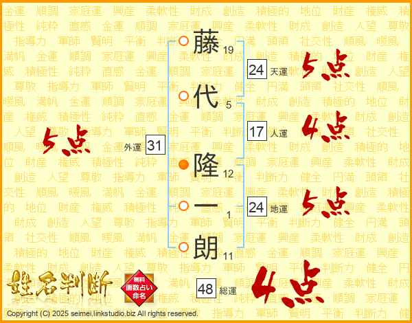 藤(19画)代(5画) 隆(12画)一(1画)朗(11画)