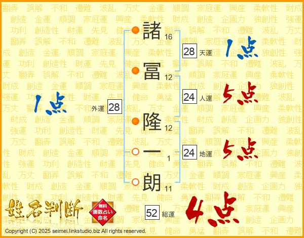諸(16画)冨(12画) 隆(12画)一(1画)朗(11画)