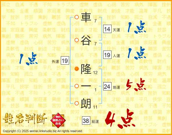 車(7画)谷(7画) 隆(12画)一(1画)朗(11画)