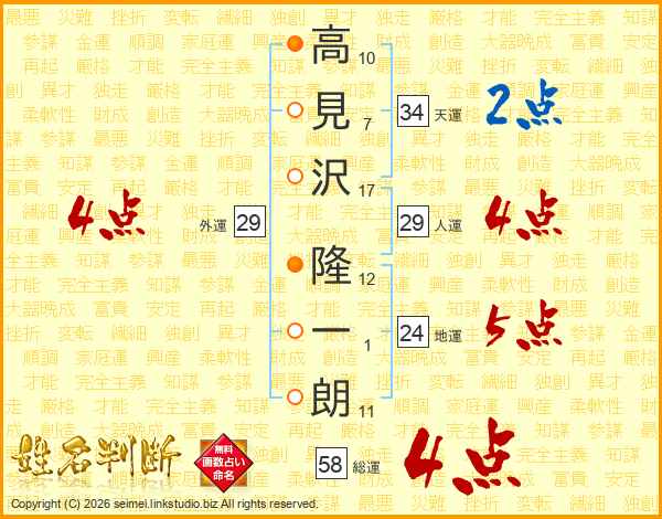 高(10画)見(7画)沢(17画) 隆(12画)一(1画)朗(11画)