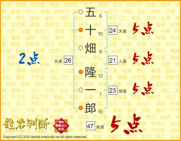 五(5画)十(10画)畑(9画) 隆(12画)一(1画)郎(10画)