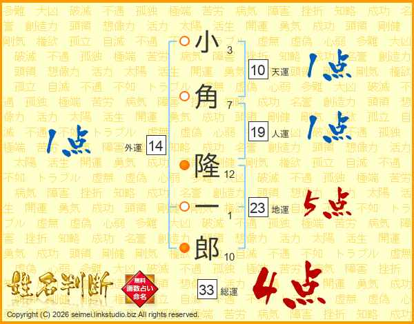小(3画)角(7画) 隆(12画)一(1画)郎(10画)