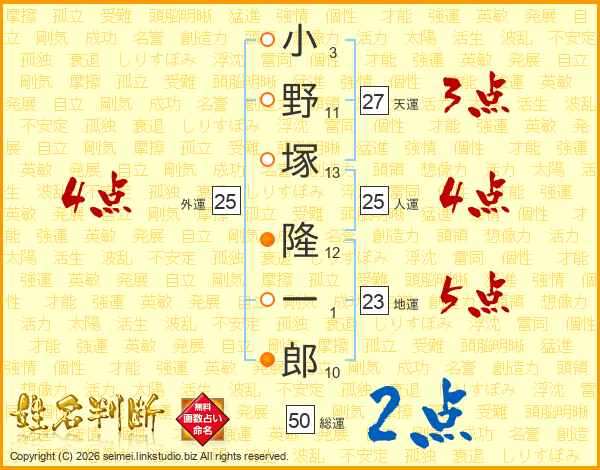 小(3画)野(11画)塚(13画) 隆(12画)一(1画)郎(10画)