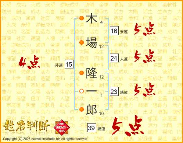 木(4画)場(12画) 隆(12画)一(1画)郎(10画)