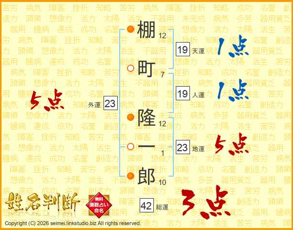 棚(12画)町(7画) 隆(12画)一(1画)郎(10画)