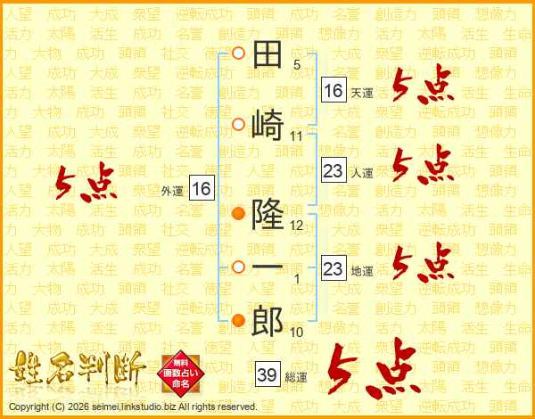 田(5画)崎(11画) 隆(12画)一(1画)郎(10画)