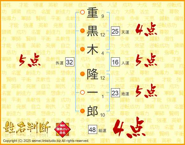 重(9画)黒(12画)木(4画) 隆(12画)一(1画)郎(10画)