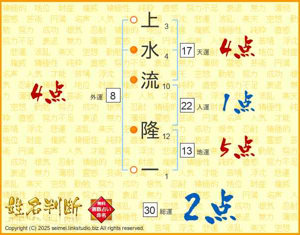 上(3画)水(4画)流(10画) 隆(12画)一(1画)