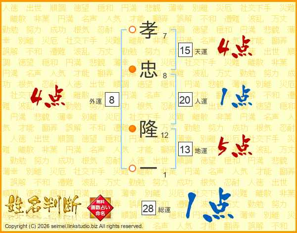 孝(7画)忠(8画) 隆(12画)一(1画)
