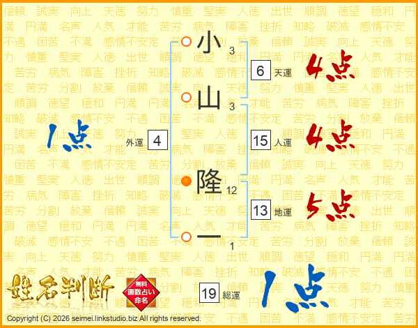生活面を象徴する運勢です。外部から受ける影響力を表し、結婚運、家庭運や職場、環境への順応性を表します。総運から人運を引いた画数。姓や名が1文字の場合を除く。