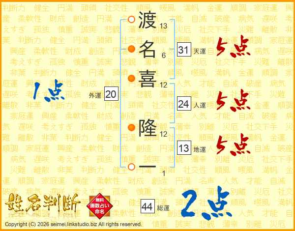 渡(13画)名(6画)喜(12画) 隆(12画)一(1画)