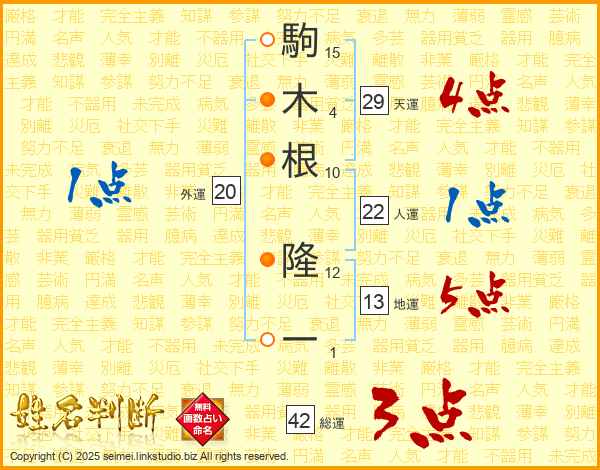 駒(15画)木(4画)根(10画) 隆(12画)一(1画)