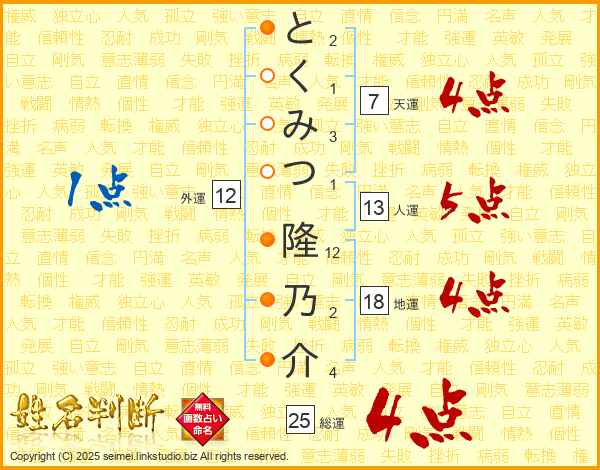 と(2画)く(1画)み(3画)つ(1画) 隆(12画)乃(2画)介(4画)