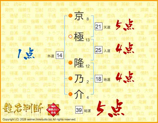 京極隆乃介さんの総運は39画の5点!