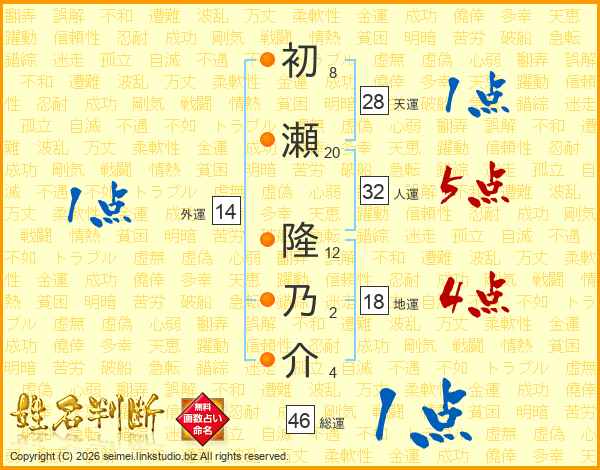 初(8画)瀬(20画) 隆(12画)乃(2画)介(4画)