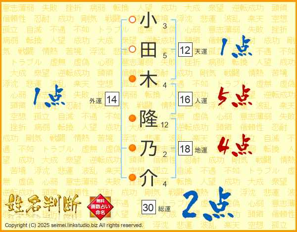 小(3画)田(5画)木(4画) 隆(12画)乃(2画)介(4画)