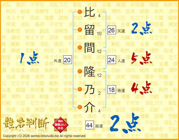 比(4画)留(10画)間(12画) 隆(12画)乃(2画)介(4画)