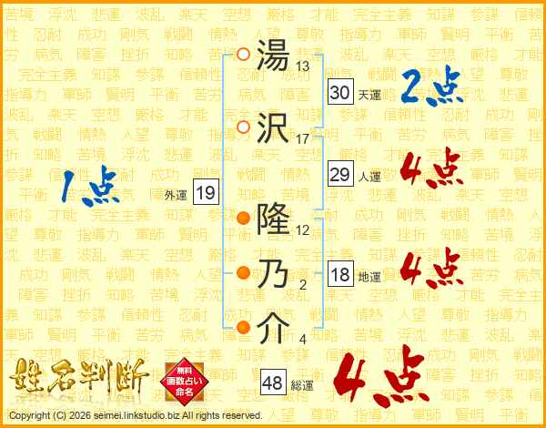 湯(13画)沢(17画) 隆(12画)乃(2画)介(4画)