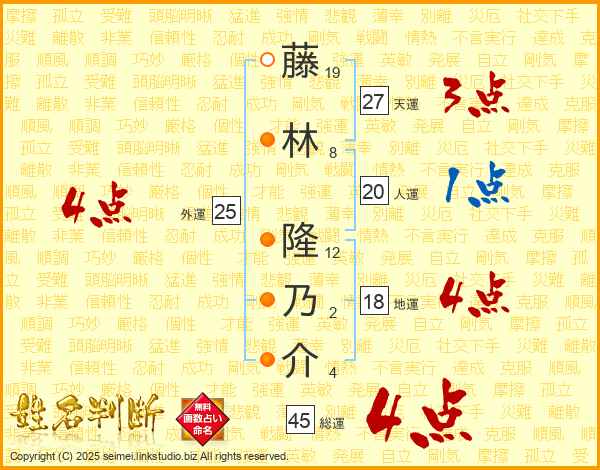 藤(19画)林(8画) 隆(12画)乃(2画)介(4画)