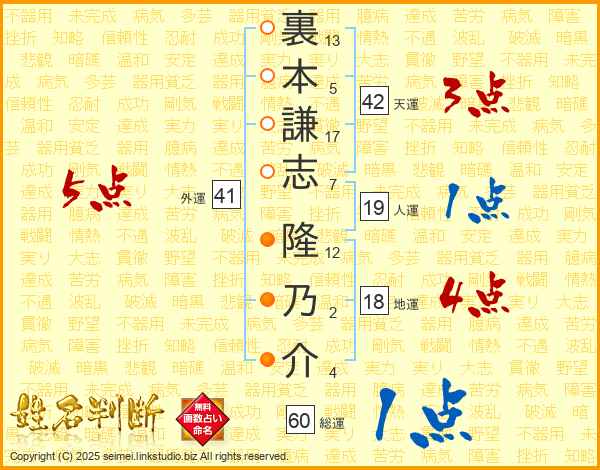 裏(13画)本(5画)謙(17画)志(7画) 隆(12画)乃(2画)介(4画)