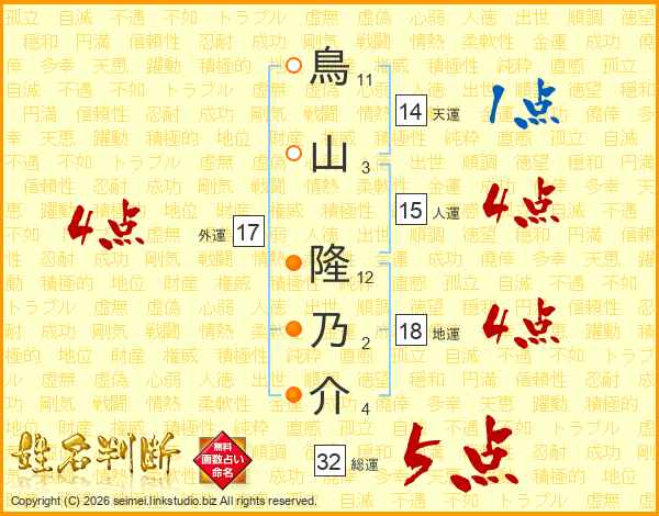 鳥(11画)山(3画) 隆(12画)乃(2画)介(4画)