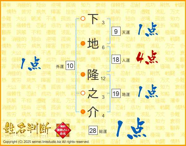 下(3画)地(6画) 隆(12画)之(3画)介(4画)