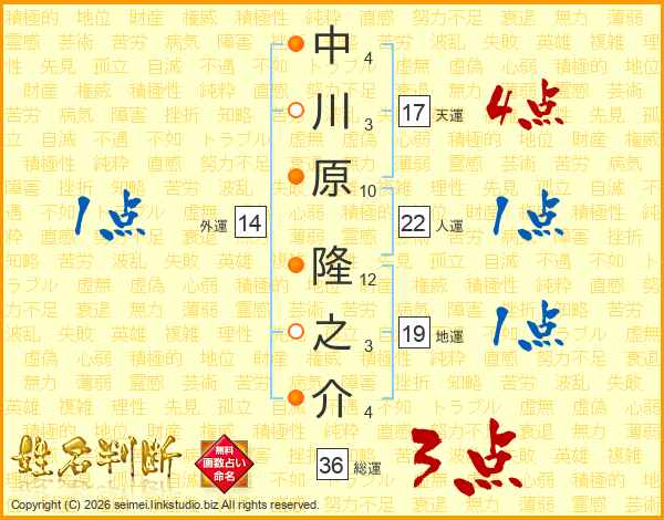 生活面を象徴する運勢です。外部から受ける影響力を表し、結婚運、家庭運や職場、環境への順応性を表します。総運から人運を引いた画数。姓や名が1文字の場合を除く。