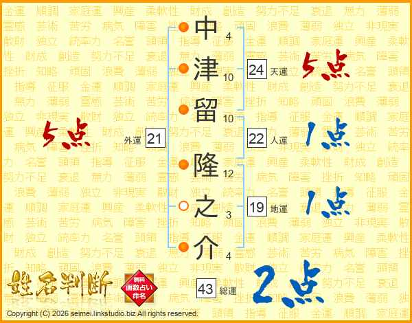 中(4画)津(10画)留(10画) 隆(12画)之(3画)介(4画)