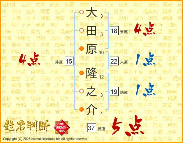 大田原隆之介さんの総運は37画の5点!