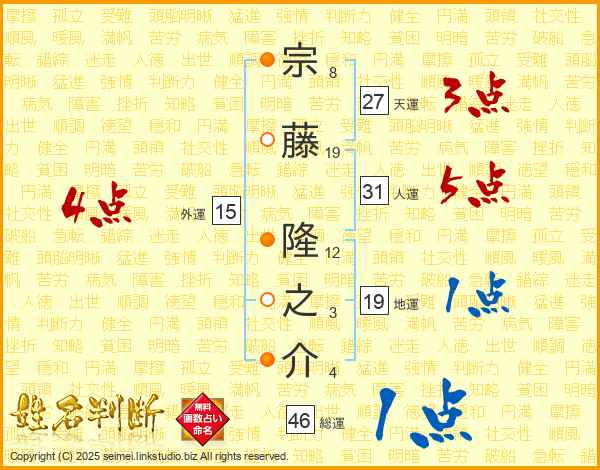 宗(8画)藤(19画) 隆(12画)之(3画)介(4画)