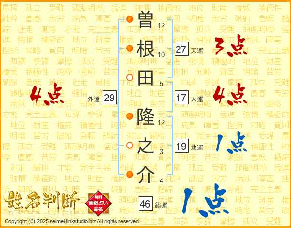 曽(12画)根(10画)田(5画) 隆(12画)之(3画)介(4画)