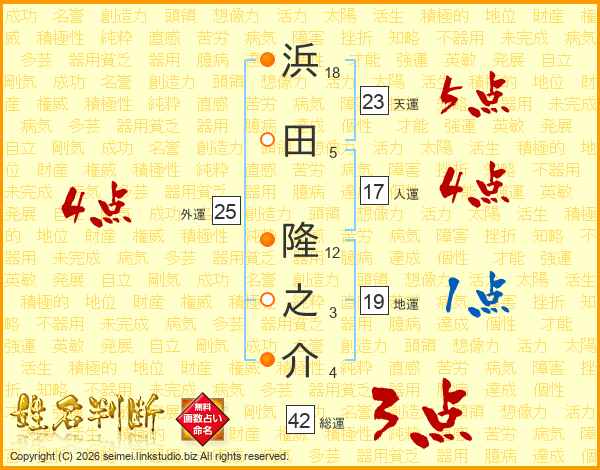 浜(18画)田(5画) 隆(12画)之(3画)介(4画)