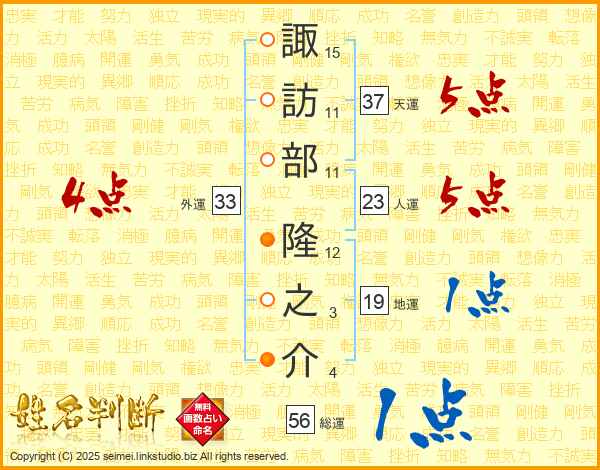 諏(15画)訪(11画)部(11画) 隆(12画)之(3画)介(4画)