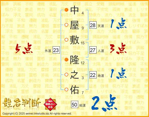 中(4画)屋(9画)敷(15画) 隆(12画)之(3画)佑(7画)