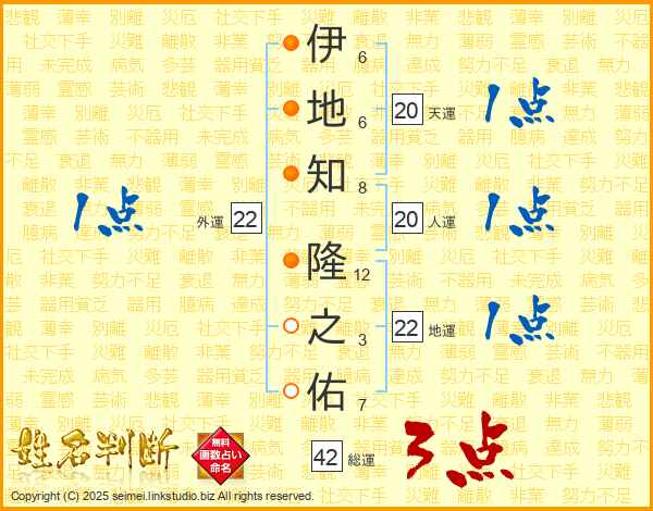 伊(6画)地(6画)知(8画) 隆(12画)之(3画)佑(7画)