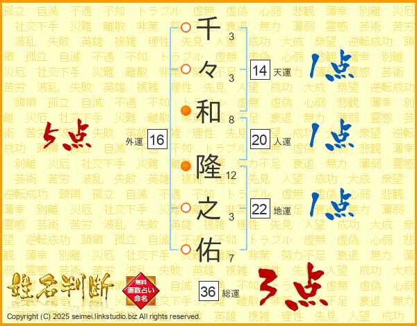 千(3画)々(3画)和(8画) 隆(12画)之(3画)佑(7画)