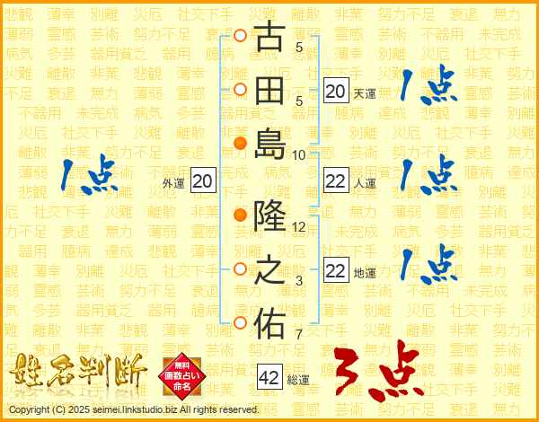 古(5画)田(5画)島(10画) 隆(12画)之(3画)佑(7画)