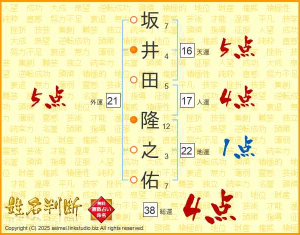 坂(7画)井(4画)田(5画) 隆(12画)之(3画)佑(7画)