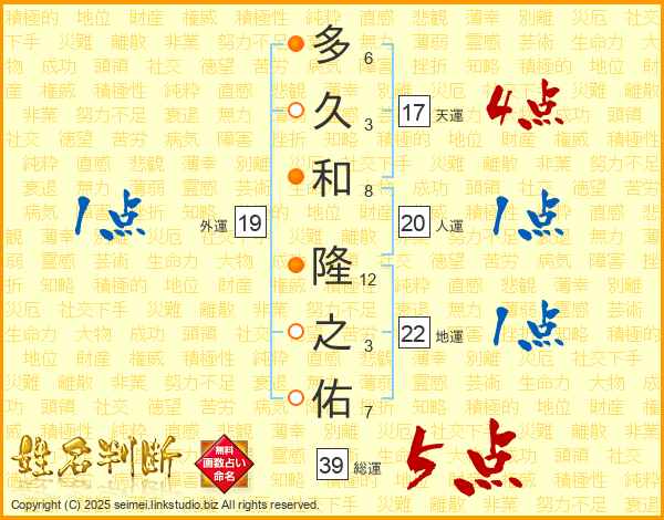 多(6画)久(3画)和(8画) 隆(12画)之(3画)佑(7画)