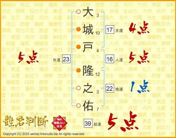 大城戸隆之佑さんの総運は39画の5点!