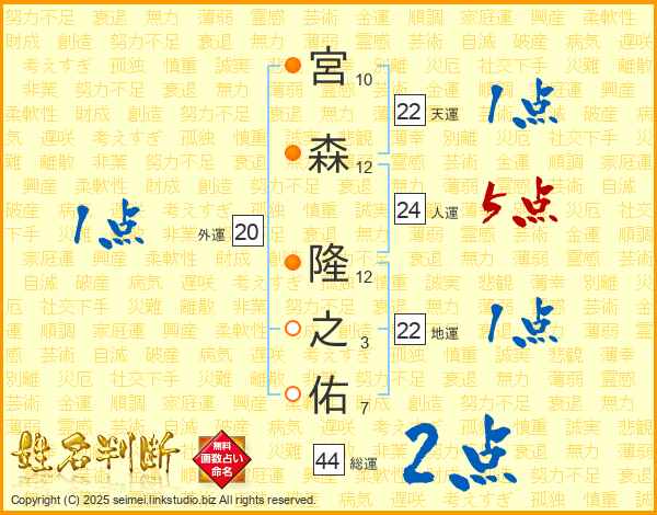 宮(10画)森(12画) 隆(12画)之(3画)佑(7画)