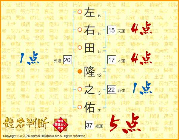 左(5画)右(5画)田(5画) 隆(12画)之(3画)佑(7画)