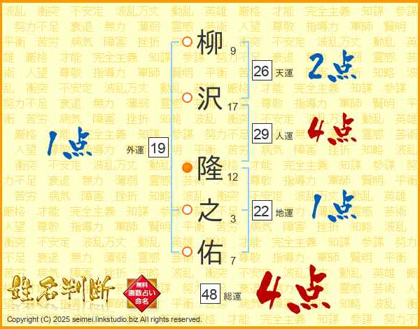 柳(9画)沢(17画) 隆(12画)之(3画)佑(7画)