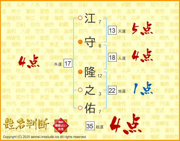 江(7画)守(6画) 隆(12画)之(3画)佑(7画)