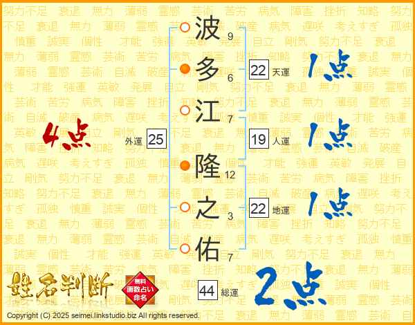 波(9画)多(6画)江(7画) 隆(12画)之(3画)佑(7画)