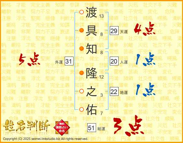 渡(13画)具(8画)知(8画) 隆(12画)之(3画)佑(7画)