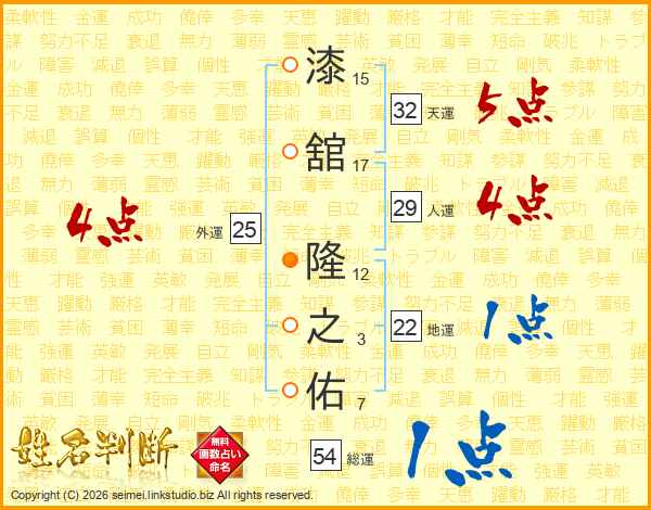 漆(15画)舘(17画) 隆(12画)之(3画)佑(7画)