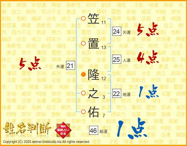 笠(11画)置(13画) 隆(12画)之(3画)佑(7画)